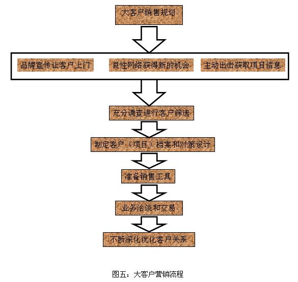 大客戶是指直接大型用戶,從北恩產(chǎn)品的用戶群體來看涉及的行業(yè)較多和用戶較復(fù)雜,如果全面突擊必會導(dǎo)致公司資源的分散和精力分配不足。面對激烈的競爭,必須根據(jù)產(chǎn)品特色和各細分市場的特征,確定我們的目標市場才能找到核心大客戶,建立在此市場的絕對優(yōu)勢地位,方能在全國市場擁有一席之地。根據(jù)北恩電聲未來發(fā)展趨勢,大客戶是北恩電聲爭奪的制高點,只有占領(lǐng)制高點才能掌握主動。(見圖五)
