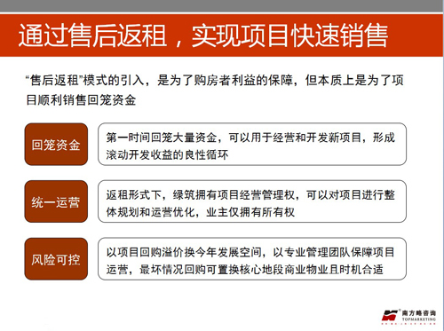 3、項(xiàng)目的商業(yè)產(chǎn)品,體量3萬余方,在三四級城市可謂不大不小,但萬州整體商業(yè)市場已被前期進(jìn)入市場的萬達(dá)金街、其它樓盤項(xiàng)目底商所擠壓,而且區(qū)域內(nèi)不論是居住人口還是社區(qū)底商的開業(yè)率都非常低,現(xiàn)在進(jìn)入,只能享受價值升值空間,短期內(nèi)難以獲得穩(wěn)定收入,因此,項(xiàng)目組經(jīng)過深思熟慮,提出“售后返租“或“租售結(jié)合”的復(fù)合營銷模式。“售后返租“模式的引入,本質(zhì)上還是為了項(xiàng)目順利銷售回籠資金。