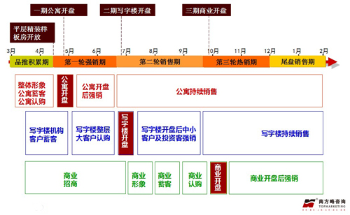 又根據(jù)時間規(guī)劃,建議項(xiàng)目分為三期推盤,并對每次推盤的時間,宣傳推廣時間及推廣內(nèi)容做了明確的規(guī)劃及部署。