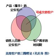 那么兩個(gè)定位的鎖定客戶,就是我們所談的“客戶的質(zhì)”。而它們的關(guān)系也很易見,很多的銷售人員只關(guān)注產(chǎn)品(服務(wù))的定位,只關(guān)注產(chǎn)品(服務(wù))有沒有市場、有多大市場,卻沒有考慮過“自己的質(zhì)”有多大市場,忽略了自己的本身也有“定位”,就會出現(xiàn)低效能的銷售行為。如果銷售人員認(rèn)為自己還行,而忘記了企業(yè)產(chǎn)品(服務(wù))的客戶定位,那就會出現(xiàn)“客情”搞得都不錯(cuò),就是很難有高的業(yè)績產(chǎn)生。若借“三圈理論”一用,那么,產(chǎn)品(服務(wù))的客戶定位這個(gè)圈,銷售人的客戶定位一個(gè)圈,還有客戶需求時(shí)間限一個(gè)圈,三個(gè)圈的重疊區(qū)才是我們現(xiàn)在所能成交的客戶。