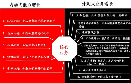 企業(yè)增長其主要途徑是圍繞核心業(yè)務(wù)展開的內(nèi)涵式能力增長與外延式業(yè)務(wù)增長。內(nèi)涵式能力增長能通過培養(yǎng)企業(yè)核心競(jìng)爭(zhēng)力和運(yùn)作能力,獲得長期競(jìng)爭(zhēng)優(yōu)勢(shì);外延式業(yè)務(wù)增長能實(shí)現(xiàn)業(yè)務(wù)的跳躍式成長,在短期內(nèi)改變業(yè)務(wù)單元在其所在領(lǐng)域的競(jìng)爭(zhēng)地位,此二者相輔相成,相互支持。戰(zhàn)略增長模型如下: